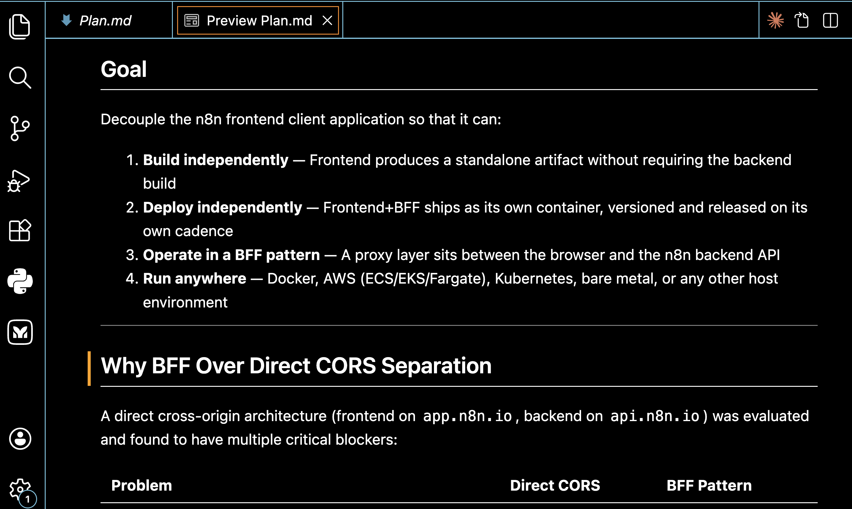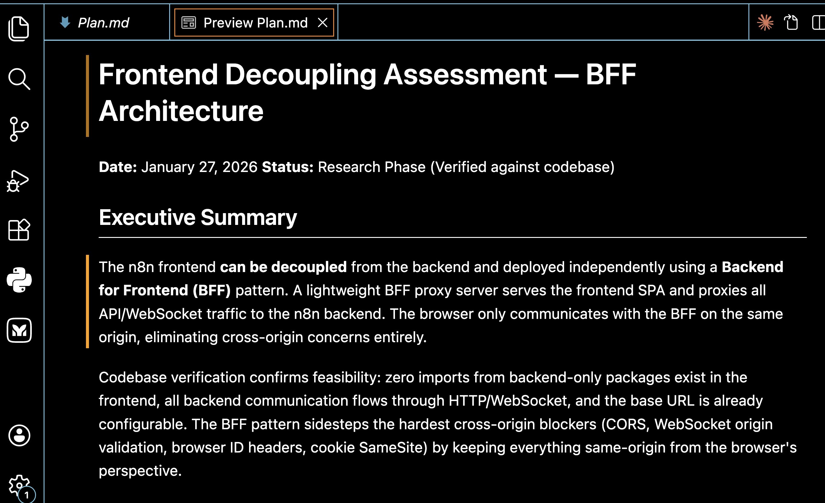 Recently, I pressure-tested this new “AI-Engineering” workflow by attempting a non-trivial architectural change: decoupling the n8n frontend from its monolithic backend using a Backend-for-Frontend (BFF) pattern. Using Claude Code in the terminal and a “Human-in-the-Loop” strategy, I navigated a complex refactor that would typically take weeks in a matter of hours.