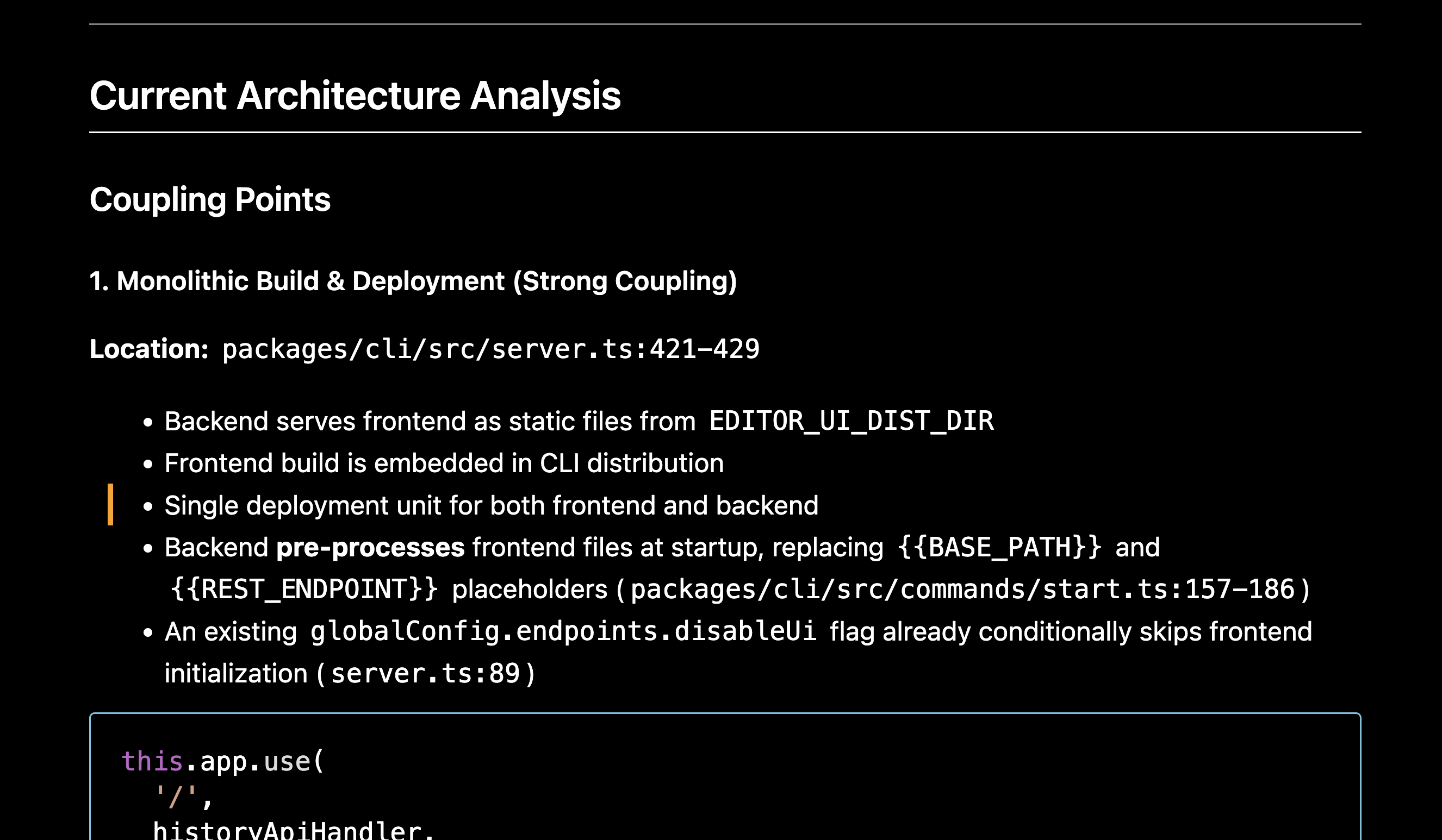 As noted in the Frontend Decoupling Assessment, we identified critical coupling points, such as the server.ts file serving static assets and the start.ts file preprocessing frontend placeholders like {{BASE_PATH}}. By using the AI to perform a comprehensive “Codebase Verification,” we confirmed that zero imports from backend-only packages existed in the frontend, making the refactor feasible.